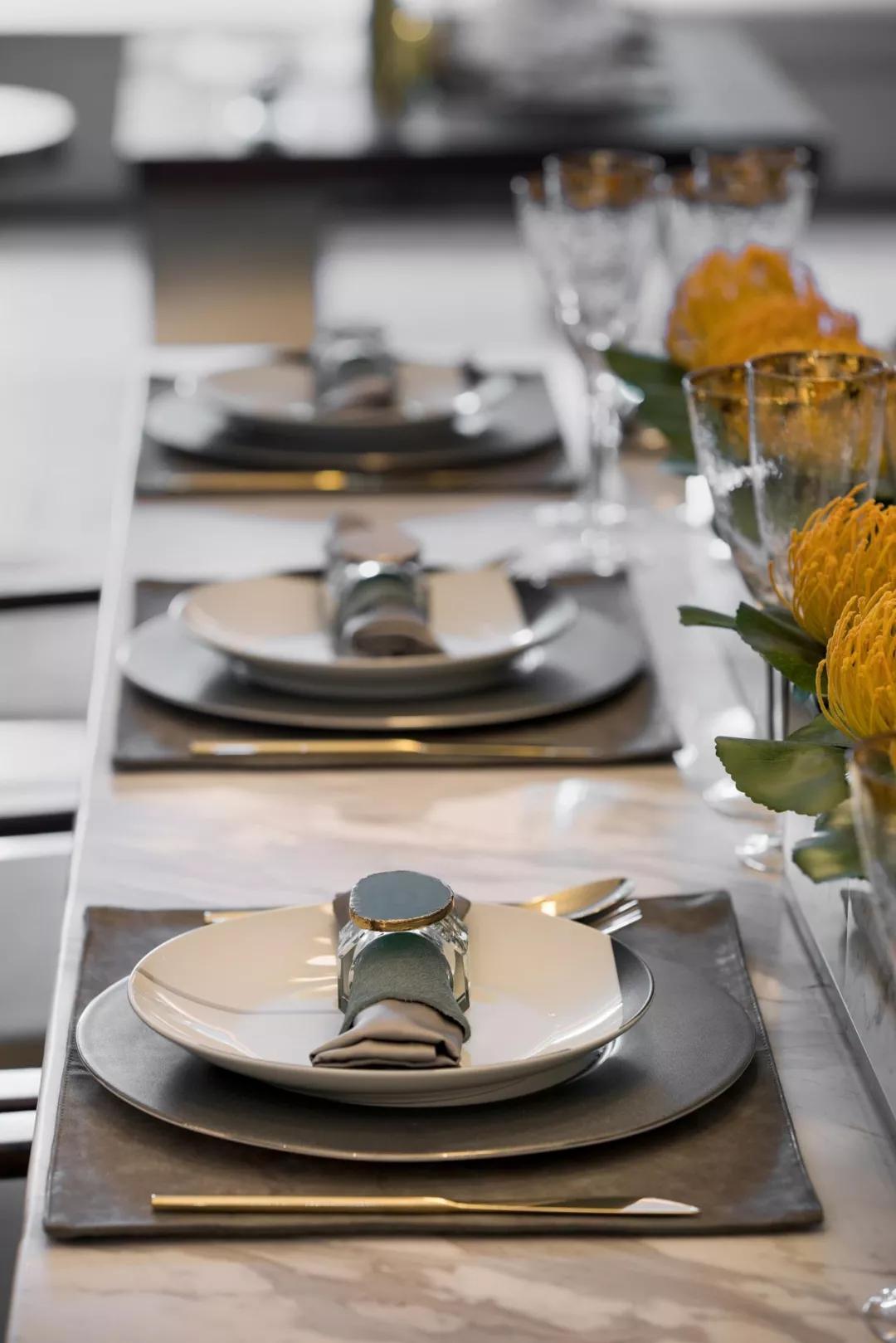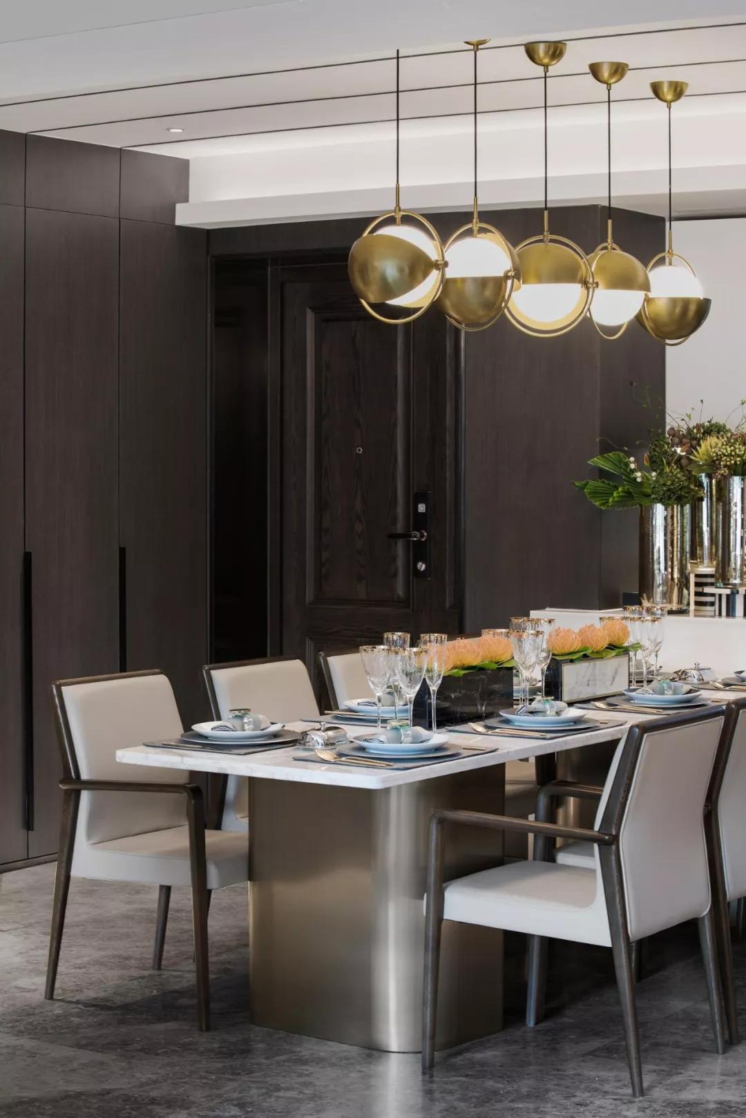 餐厅打破传统的陈设布局方式,餐桌的纵向性布局和吊灯装置阵列分布相呼应,饰品的摆放不再那么规整,看似随意的布局,增加国产无遮挡羞羞视频的自由度和个性。